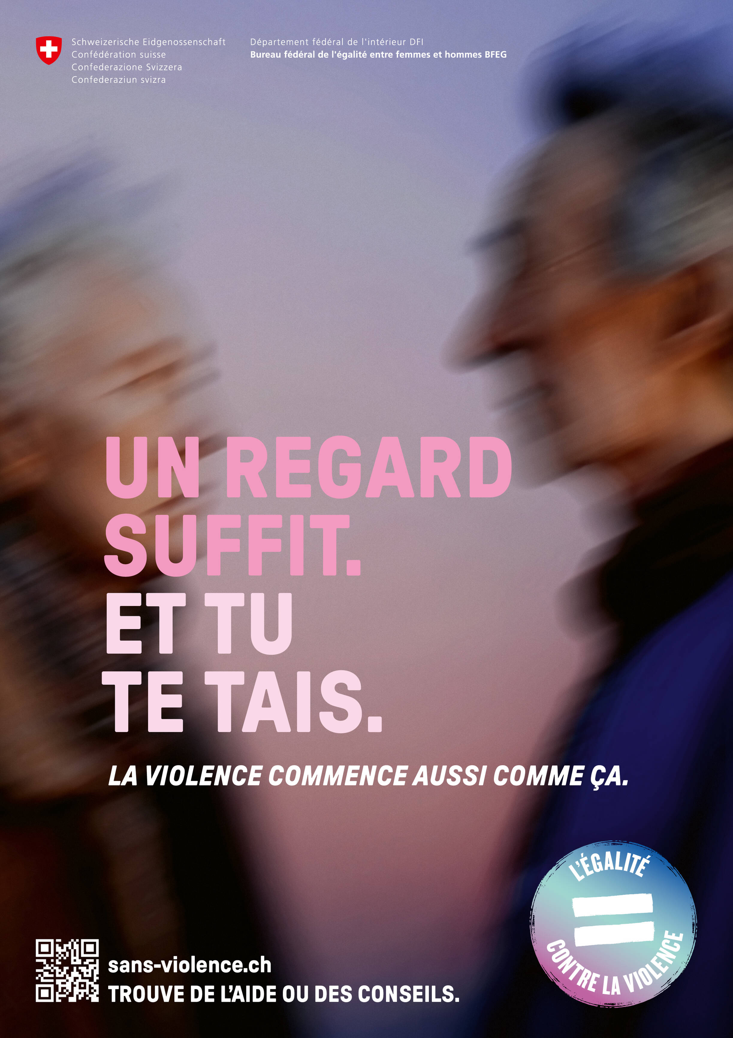 La campagne lancée par la Confédération a pour but de sensibiliser la population aux signes avant-coureurs de la violence, que cela soit à la maison, dans la rue ou au travail et de montrer que l’égalité est un important facteur de protection. Il s’agit également de donner à chaque personne concernée – les victimes, leur entourage et les personnes violentes ou potentiellement violentes – les moyens de réagir de manière appropriée et de trouver l’aide nécessaire.
